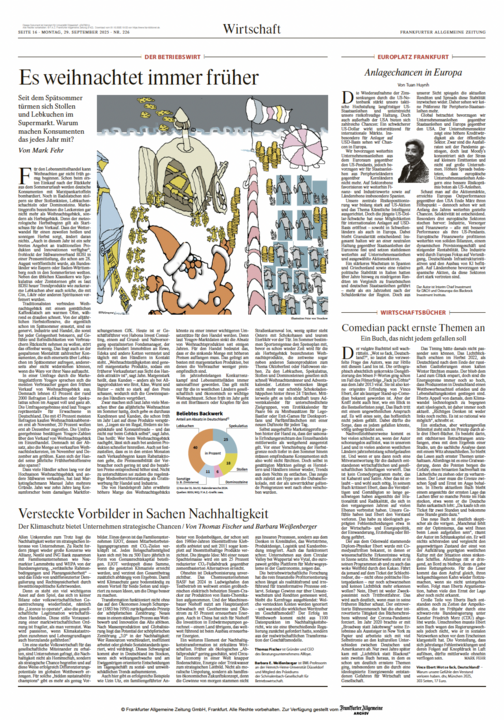 Prof. Dr. Barbara E. Weißenberger und Dr. Thomas Fischer haben in der Rubrik "Der Betriebswirt" der Frankfurter Allgemeine Zeitung vom 29.09.2025 den Beitrag "Versteckte Vorbilder in Sachen Nachhaltigkeit" veröffentlicht. In dem Artikel wird beschrieben wie Nachhaltigkeit, trotz politischer Unsicherheit und Deregulierungsdruck, ein zentrales strategisches Anliegen von Unternehmen bleibt, da sie die gesellschaftliche „Licence to operate“ sichert. Der Artikel ist hier abrufbar.