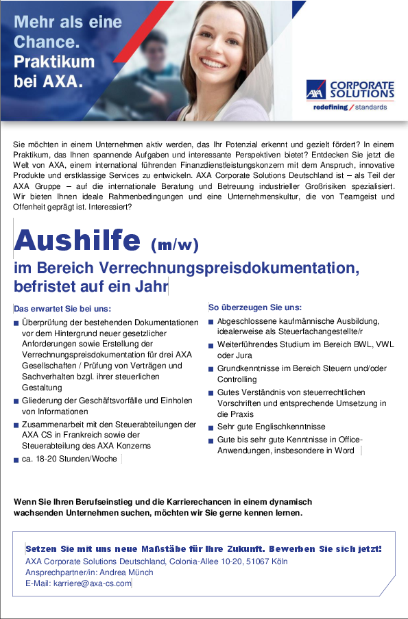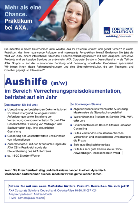 Die AXA Corporate Solutions Deutschland, Teil der AXA Gruppe, sucht zum nächstmöglichen Zeitpunkt einen Werkstudenten (m/w) für den Bereich Verrechnungspreisdokumentation.