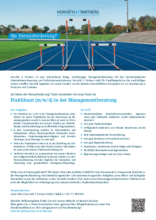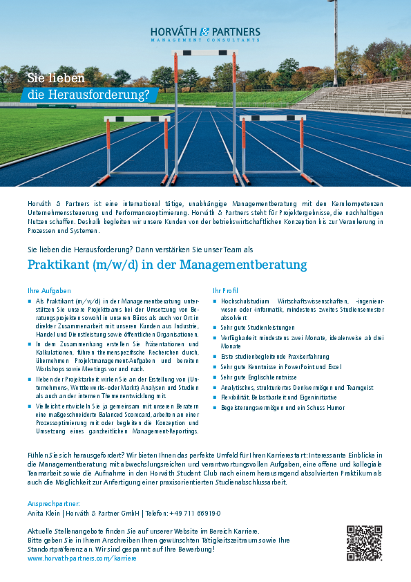 Fühlen Sie sich herausgefordert? Horváth & Partners bietet Ihnen das perfekte Umfeld für Ihre Karriereentwicklung: vielseitige Aufgaben für Ihre persönliche Entwicklung, Förderung Ihrer Kompetenzen durch Schulungsangebote und Begleitung durch eine/n Mentor/in mit regelmäßigen Feedbacks.