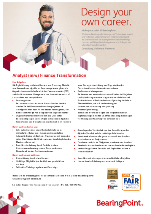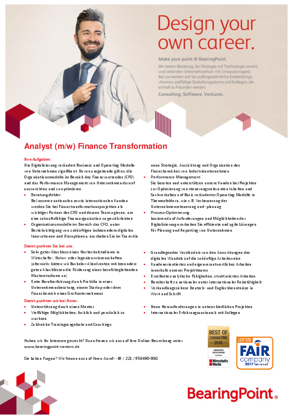 Die Unternehmensberatung BearingPoint sucht zum nächstmöglichen Zeitpunkt eine/-n Analystin/-en im Bereich Finance Transformation.