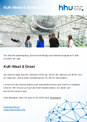 Gerne möchten wir Sie dazu am Donnerstag, den 09. Oktober 2024 um 18:30 Uhr im Haus der Universität (Schadowplatz, Düsseldorf) einladen. Wir freuen uns auf einen schönen Abend mit inspirierenden Vorträgen, aktuellen Informationen aus dem Studiengang und einem anschließenden Get-Together.