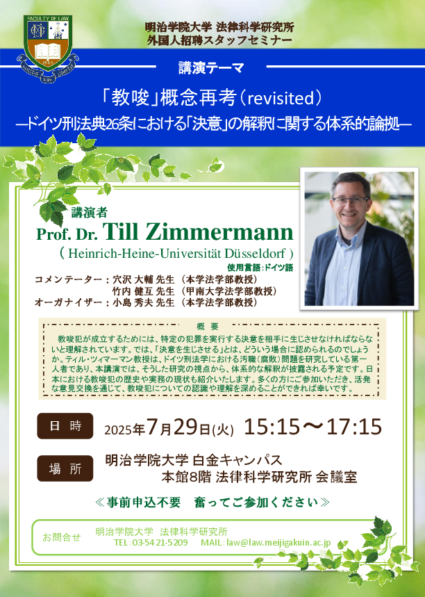 Prof. Dr. Till Zimmermann hat anlässlich einer Forschungsreise im Juli 2025 in Japan zwei strafrechtliche Vorträge an der Meiji-Gakuin Universität und einen an der Meiji-Universität in Tokio gehalten.