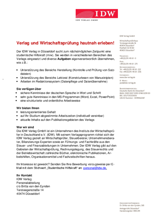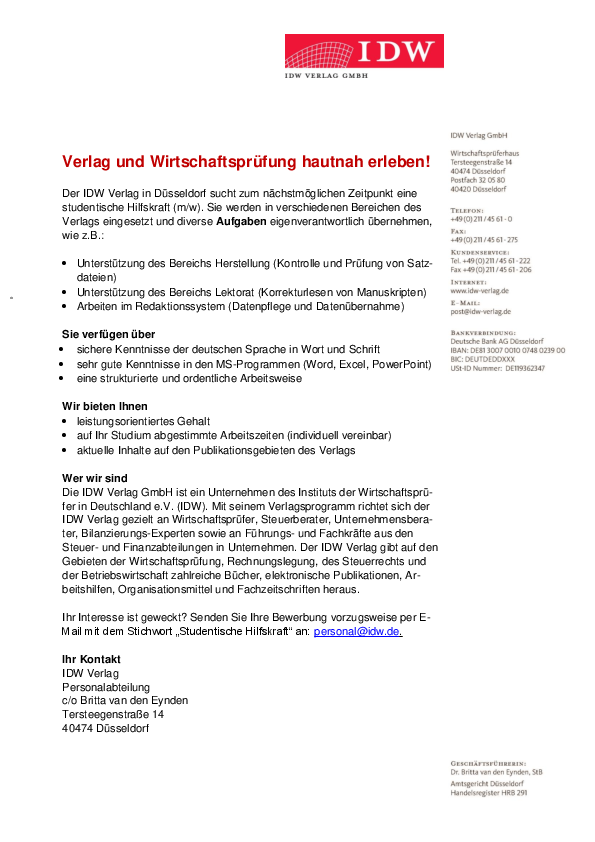 Der IDW Verlag in Düsseldorf sucht zum nächstmöglichen Zeitpunkt eine studentische Hilfskraft (m/w).