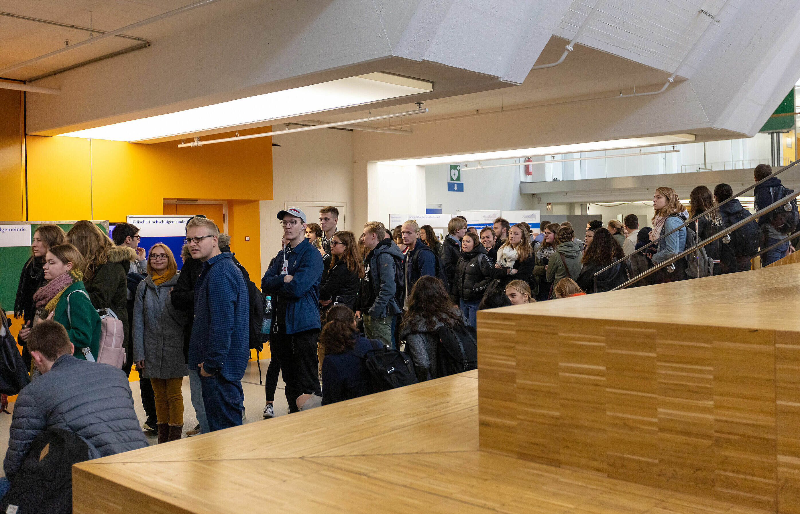 Personen des Sicherheitsdienstes zählen an den Haupteingängen alle Menschen, die in die Gebäude kommen. Die Nebenzugänge von 22.01 und 23.01 werden abgesperrt. Beide Hörsaalgebäude sind zwischen 8:00 und 9:30 Uhr komplett geschlossen. Gegen 12:30 Uhr enden alle Zugangskontrollen.