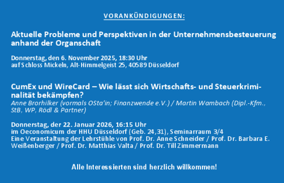 Am 06. November 2025 und am 22. Januar 2026 finden weitere steuerrechtliche Vortrags- und Diskussionsveranstaltungen statt, die auch Studierenden der…